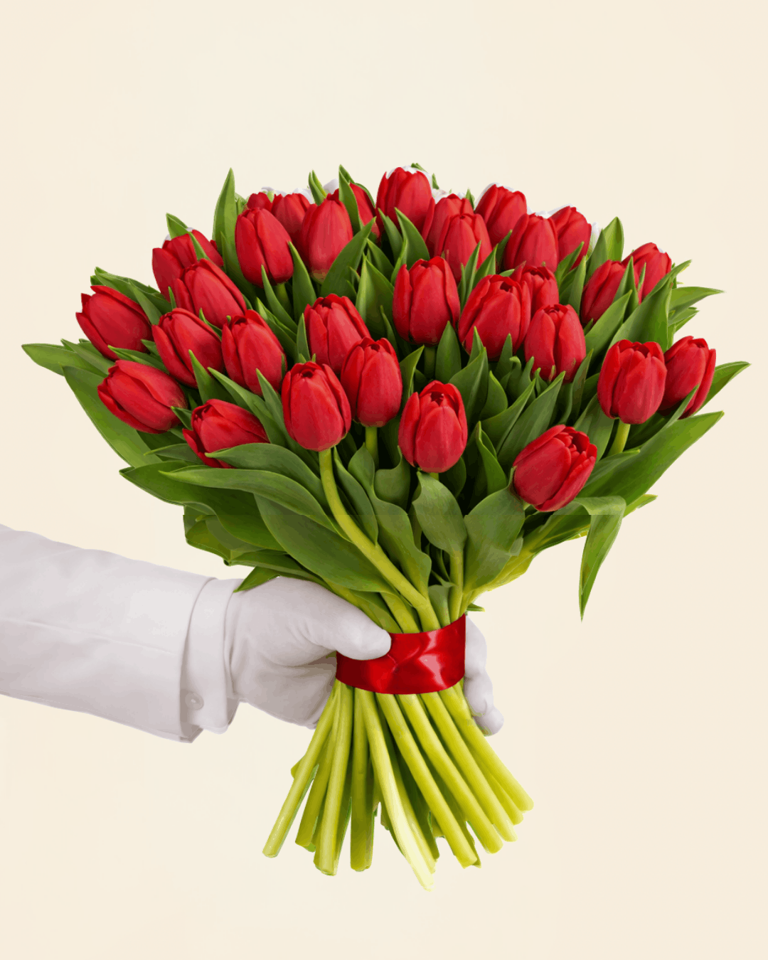 This bouquet is composed of 51 fresh red tulips.