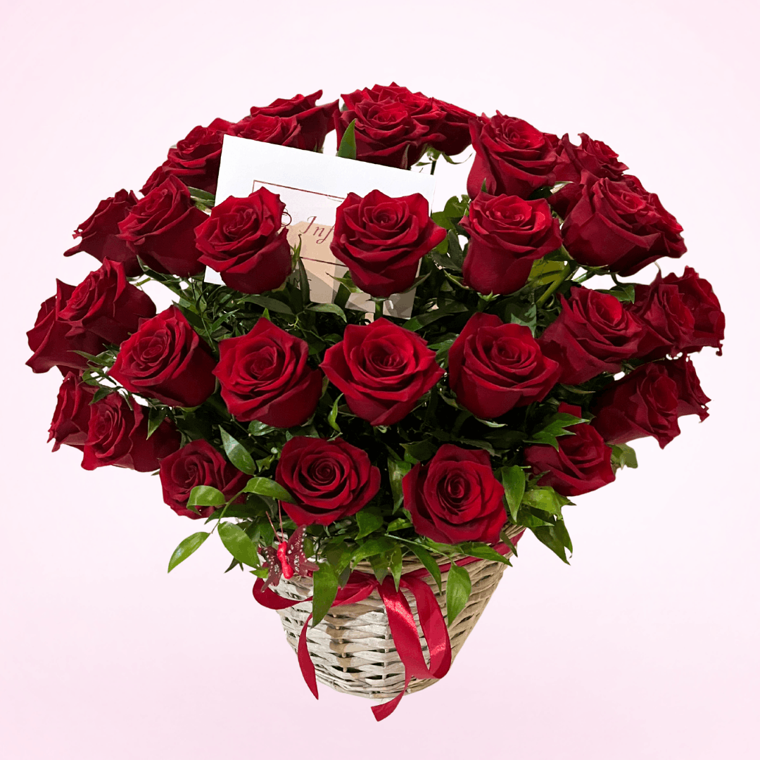 A stunning arrangement of 31 fresh red roses with greenery in a basket.