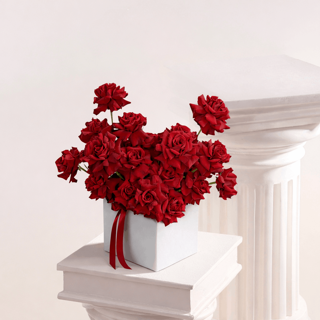 An arrangement of 29 fresh red roses, each carefully crafted with a reflexed petal technique, presented in an elegant white box with red ribbon.
